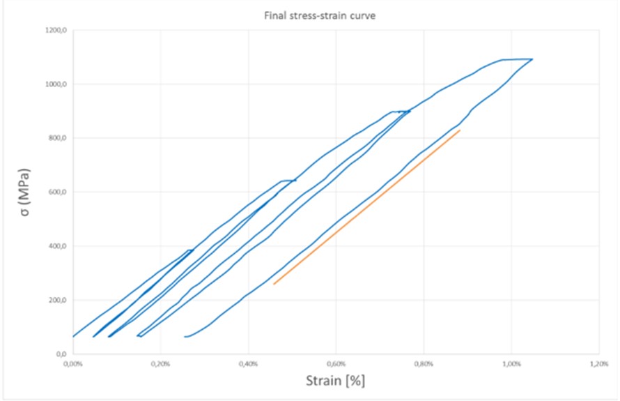 - Generation of the stress-strain curve (σ-ε), which describes the relationship between applied tension and elongation (Fig. 2). The analysis allows for the determination of key mechanical parameters, such as the material’s breaking load.