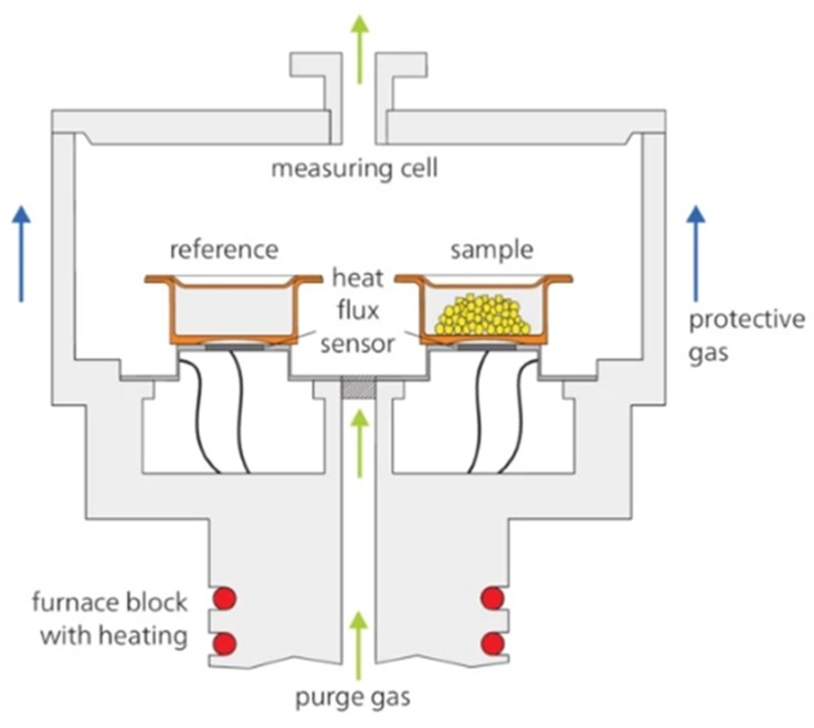 Differential Scanning Calorimetry (DSC) is an experimental technique that monitors the heat flow between a sample and a reference, which are subjected to a controlled temperature profile (heating, cooling, or isothermal), under identical conditions and in the same furnace. Any temperature difference between the sample and the reference leads to a heat flow that is proportional to the difference in their heat capacities.