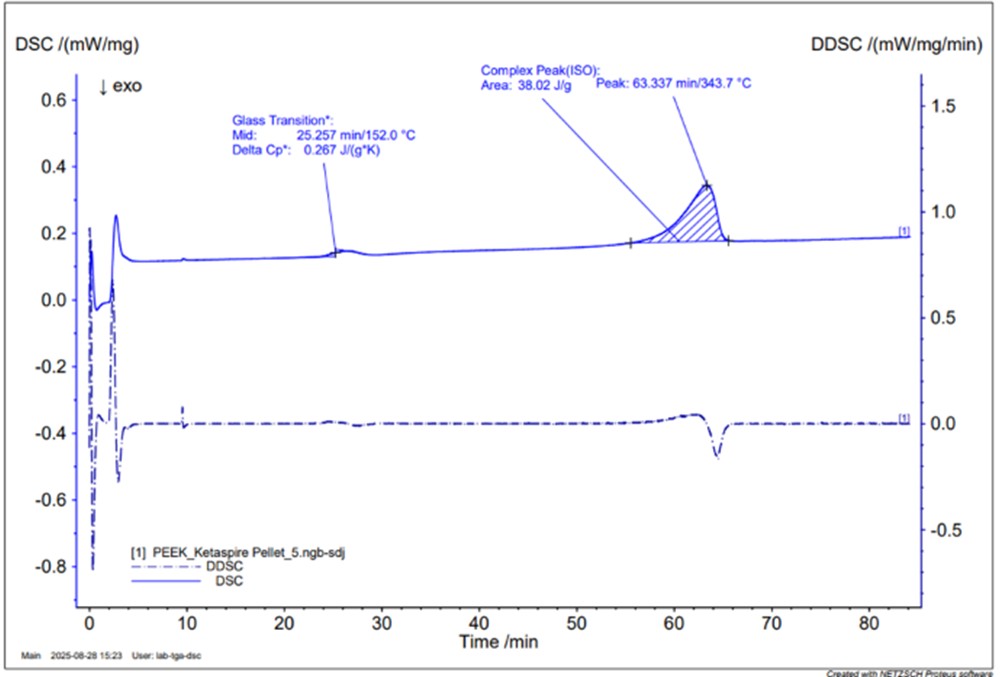 Observing the solid blue curve, two peaks related to heat absorption, also known as endothermic peaks, can be identified. From the position of the first peak, the glass transition temperature (Tg) can be derived, which corresponds to 152°C. From the second peak, we can determine the melting temperature (Tm), which corresponds to 343.7°C and, by measuring the area underneath, we can calculate the percentage of crystallinity of the material, equal to 29.25%.