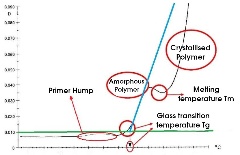 The dip between the amorphous section and the section identifying the crystallised polymer can have various causes; among the main ones are: the thermal treatment of the enamel (curing) and the electrical mobility of the molecular chains.